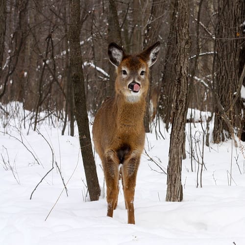 I took a small trail leading in the heart of the woods and if I wasn’t paying attention, I would never have seen them. 10 of them, all laying down in the snow. I talked to them with a gentle voice the whole time I was there, slowly approaching them. Of course they all stood up one at the time, with no hurry though. One of them, a young one, even dared to make a few steps in my direction.