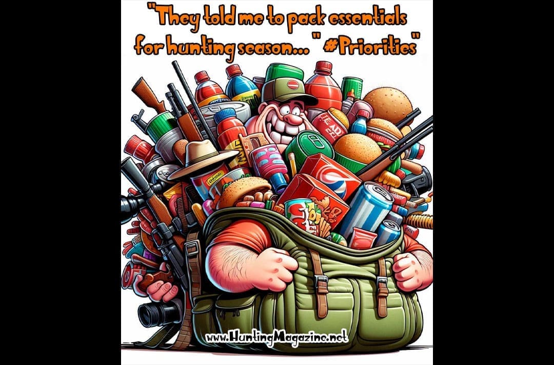 The hunting meme captures him proudly wearing a big smile as he shows off his unconventional “hunting essentials.” The hunting meme humorously reads, “They told me to pack the essentials for Hunting Season!” This is our playful twist on the typical rugged, survival-oriented hunting preparation that many hunters take in preparation for their up-coming deer hunting season and it invites a chuckle instead. We, as hunters know and understand the long waiting periods in hunting where snacks might just be the most crucial “survival gear” items one can have. It’s a funny nod to the lighter side of hunting culture, where sometimes comfort food is just as important as any other hunting gear.