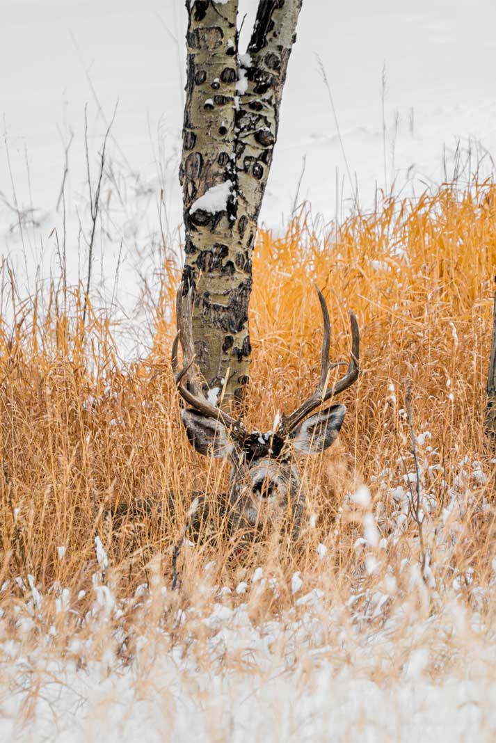 After a tense battle during the rutting season, this mule deer buck found refuge in a patch of brush – his retreat after losing to another equally combative rival mule deer buck that won the rights to breed during rut season.