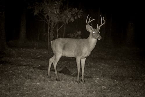 Trail camera image captured this image of a nice buck in my back yard. I only hunt these with my trail camera now days. I just wish they would stop eating my strawberries!