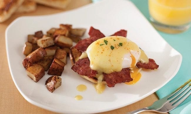 For an exciting added aspect, use duck bacon with this version of classic Eggs Benedict. This brunch menu feeds a group which is ready in less than 30 minutes, making it the perfect choice when you want to whip up a quick entree for family or friends.