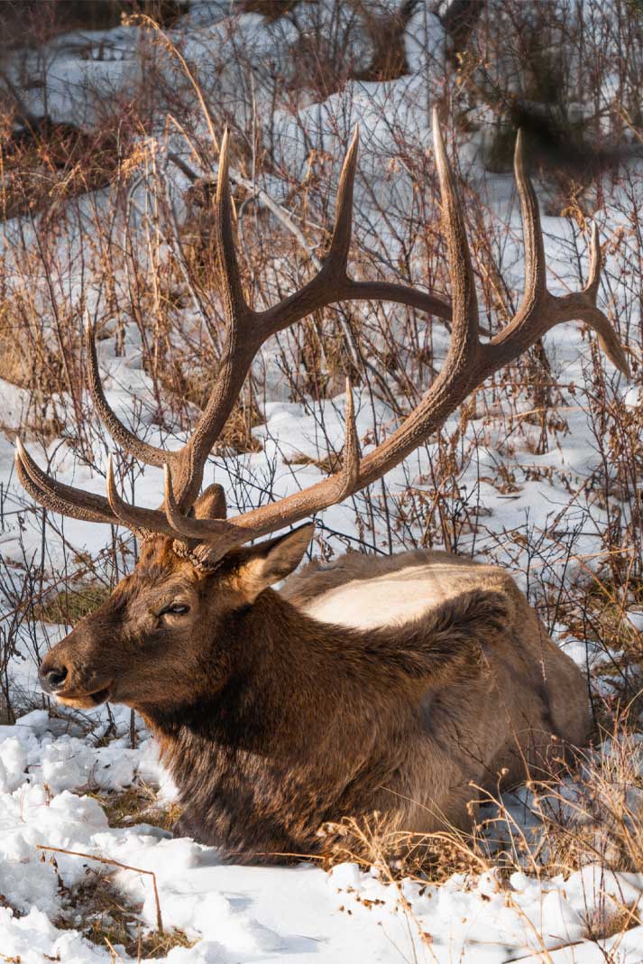 This majestic bull elk has seen better days – a noble warrior of the rut, he lays in gentle repose upon a crisp bed of snow.