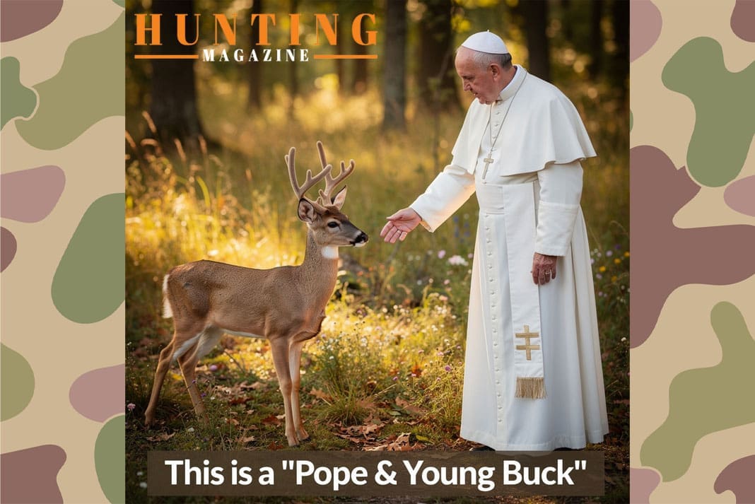 Most hunters spend their lives dreaming of a “Pope and Young” buck—referring, of course, to the prestigious record books of the Pope and Young Club. This meme flips the script by giving us a photo-realistic (and hilarious) interpretation: Pope Francis meeting a young buck in the woods.