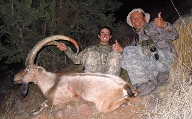 Steve shocks me and told me I missed, but I saw in the scope the ibex fall down. I knew I had a trophy ibex on the ground. Later, Steve and I figured out that he was watching another one and the clock was ticking so I had to make the call to shoot. Steve and I made our way over to the ibex it took us thirty minutes to cross the canyon and get to the ibex. I laid my hands on the horns and knew that I had just completed one of the most challenging hunts in the state. I could not thank Steve enough for teaching me when I was young how to hunt and for sharing this experience with me.